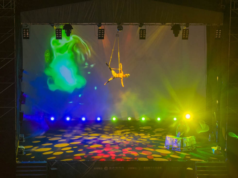 嘉義縣文化基金會今(8)日在縣府前廣場舉行大型舞台劇演出,邀請世界級藝術團隊「舞鈴劇團」帶來其獨步全球的扯鈴表演。本次演出融合肢體舞蹈、視覺聲光效果及新馬戲等多重元素,呈現一場跨越語言與文化界限的海洋風景,為觀眾帶來一場沉浸式的視覺盛宴。現場氣氛熱烈,吸引了5,000名觀眾到場觀賞,精彩的表演,讓孩子們驚呼連連。